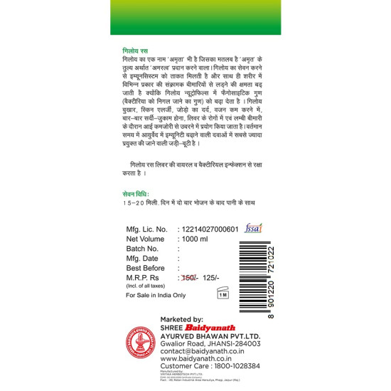 Baidyanath Jhansi | Giloy Juice1 Ltr |Natural Immunity Booster |Pure, Natural and 100% Ayurvedic Juice|| Safe for Diabetic| No Added Sugar|Giloy Juice